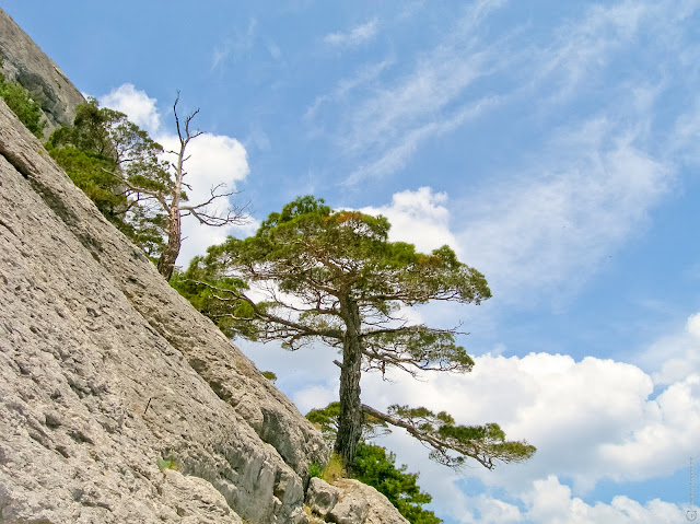 Photo conifer on a rock and blue sky with clouds